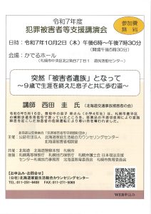 犯罪被害者等支援講演会のご案内10月2日(木)突然『被害者遺族』となって~9歳で生涯を終えた息子と共に歩む道~ 2025年9月22日 最終更新日時 : 2025年9月25日 事務局 犯罪被害者等支援講演会申込みフォーム お申込は当日も受け付けております。 開場 17:30 開演 18:00※19:30 終了予定会場 :かでるホール札幌市中央区北2条西7丁目お問合せ 011-251-6408申込締め切り:当日の受付可能です お申込みは電話、もしくは参加申込書に記入の上、FAXをお願いします。 犯罪被害者等支援講演会申込みフォーム